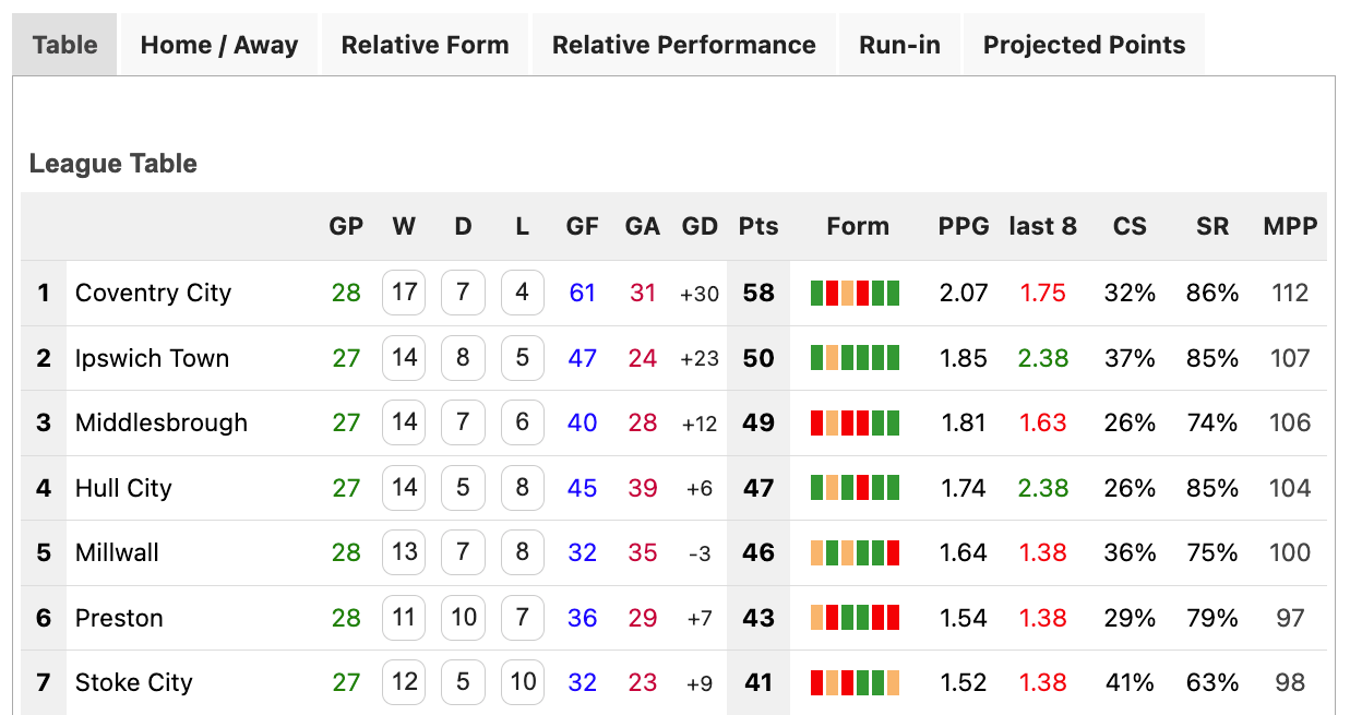 Sometimes you just need a bell-clear form guide with enough customisation to answer a question. For example, if I wanted to know ‘Which team has secured the most points since X Manager was hired?’ or ‘How do Sunderland’s and Coventry’s points tally up over two seasons?’, I would use TWTD’s form guide page. An Ipswich fan board may seem an odd place to look, but it works. Many of these sites publish the same information, but it’s all about ease of use, and this is easy, intuitive and seamlessly customisable.