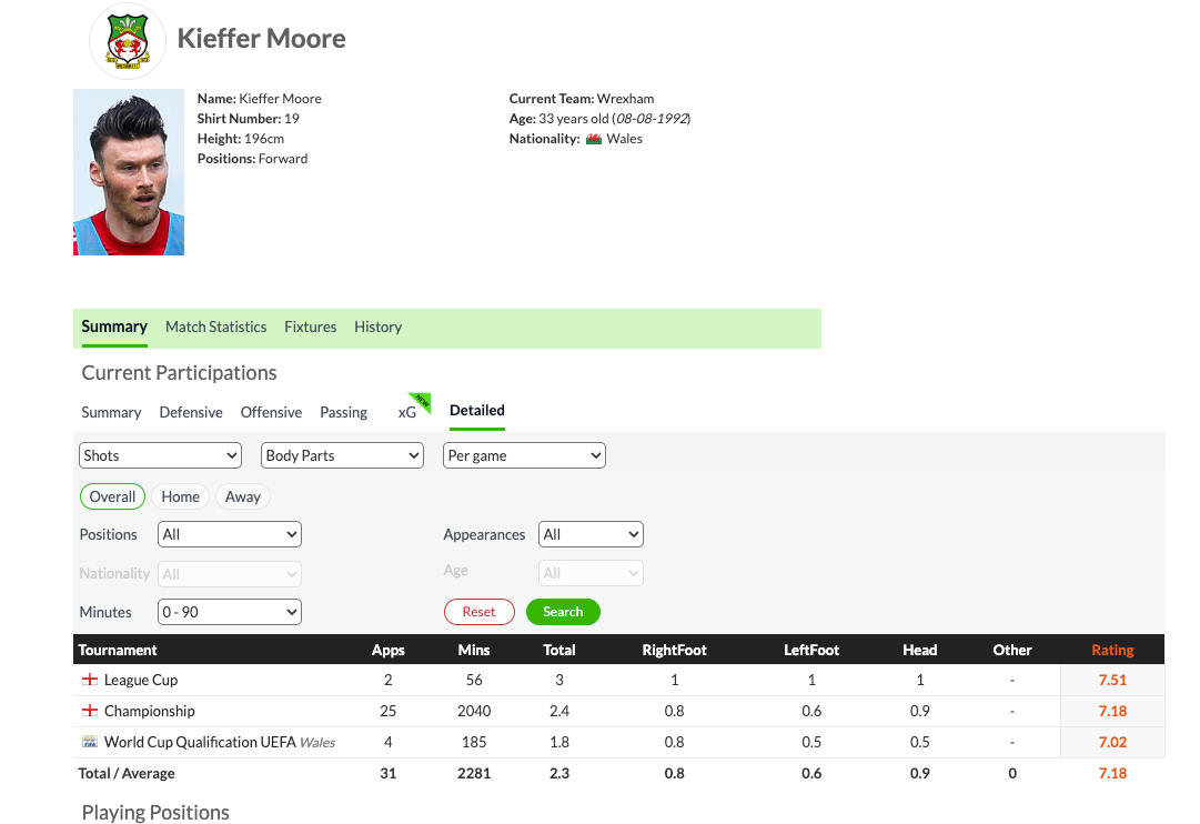 In terms of its statistics database, it breaks down a lot of stats into helpful categories. For example, if I want to know how many goals Kieffer Moore has scored with his head, his left foot and his right foot, I’d go to WhoScored’s detailed player stats tab.