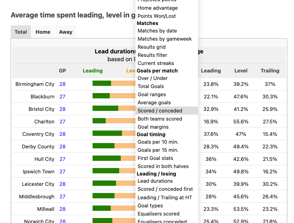 Goals stats (over/under, both teams scored, number scored/conceded – perfect for my obsession with zeroes and ones!)