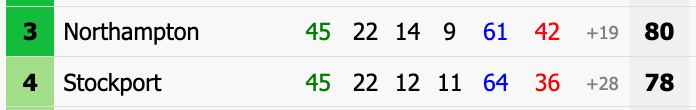 Stockport are 1/5 to beat Hartlepool on Monday. Their hosts are relegated, albeit they've been fairly solid under John Askey. But Askey hung his Hartlepool players out to dry a little bit last time out, which might make for an interesting team selection. It wouldn't surprise me if quite a few senior pros who are on their way out don't even play. So, it's a perfect game for Stockport, and if they win it, then their goal difference will be at least ten better than Northampton. Let’s just give them the win and assume Stockport County finish on 81 points.