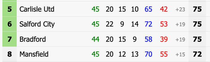 If the Stags-win-someone-loses scenario happens, then Bradford’s goal difference is the most easily overcome. Salford’s goal difference is surmountable. But realistically, Carlisle’s isn’t - Stags would need an eight-goal swing to level.