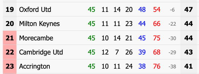 That means that one of MK Dons or Morecambe have to win in order to overtake them and secure their own safety; a draw for either would not be enough (obviously, if Cambridge do drop points, all of that changes for Cambridge, but the equation remains the same for the two Ms).