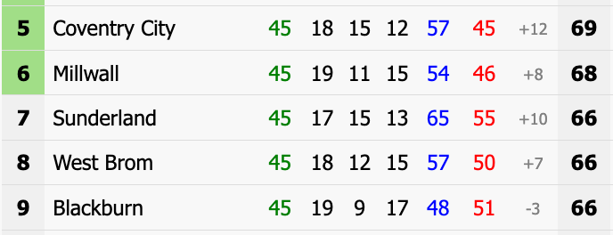 West Brom (8th) are also on 66. Two points behind Millwall and three from Cov, but their +7 goal difference means that catching Coventry, in particular, will be very, very difficult.