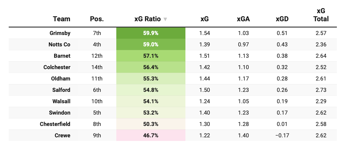 All of that augurs well. But the reality is that all three teams have had patches of average-to-poor results. Still, of the teams placed 4th to 10th, only Grimsby and Notts County have a better season-long xG share. All three suppress chances better than sides like Chesterfield, and all three create more than sides like Notts County.