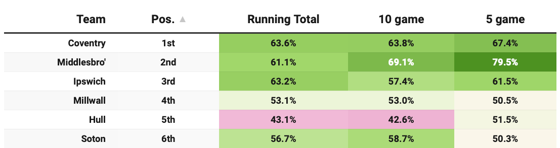 All season, the underlying numbers have depicted Hull as a side with far blunter claws than results suggest. Their matches generate the highest xG total in the league, at 3.09, and across the season they have split that 43% to 57% with their opponents, while averaging 1.69 PPG.