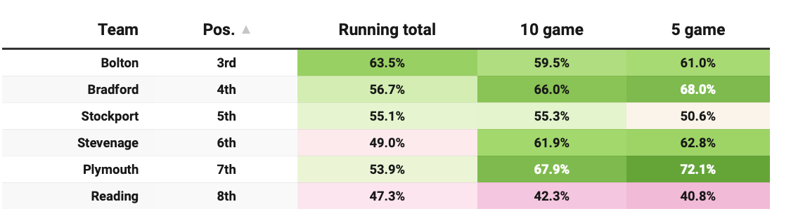 For Reading, that alarm has been snoozed. Over the last ten games they are around five percentage points down on their season xG share, and around seven points down over the last five.