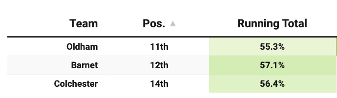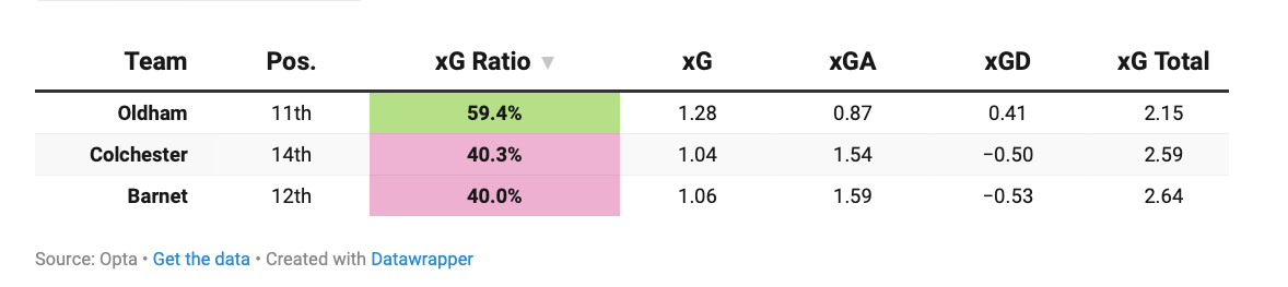 Across the season, all three sit well (and rather similarly) when it comes to their share of expected goals. What is their share of REAL GOALS? Oldham have 58.7%, Colchester 54.9% and Barnet 53.3%.