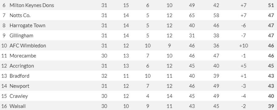 Since New Year’s Day, nine different teams have occupied a play-off spot in League Two, but who will be in the top seven when the music stops on April 27th? With the teams between 6th and 16th currently separated by just ten points, here’s a look at some of the lesser-mentioned runners and riders for a play-off spot in League Two: