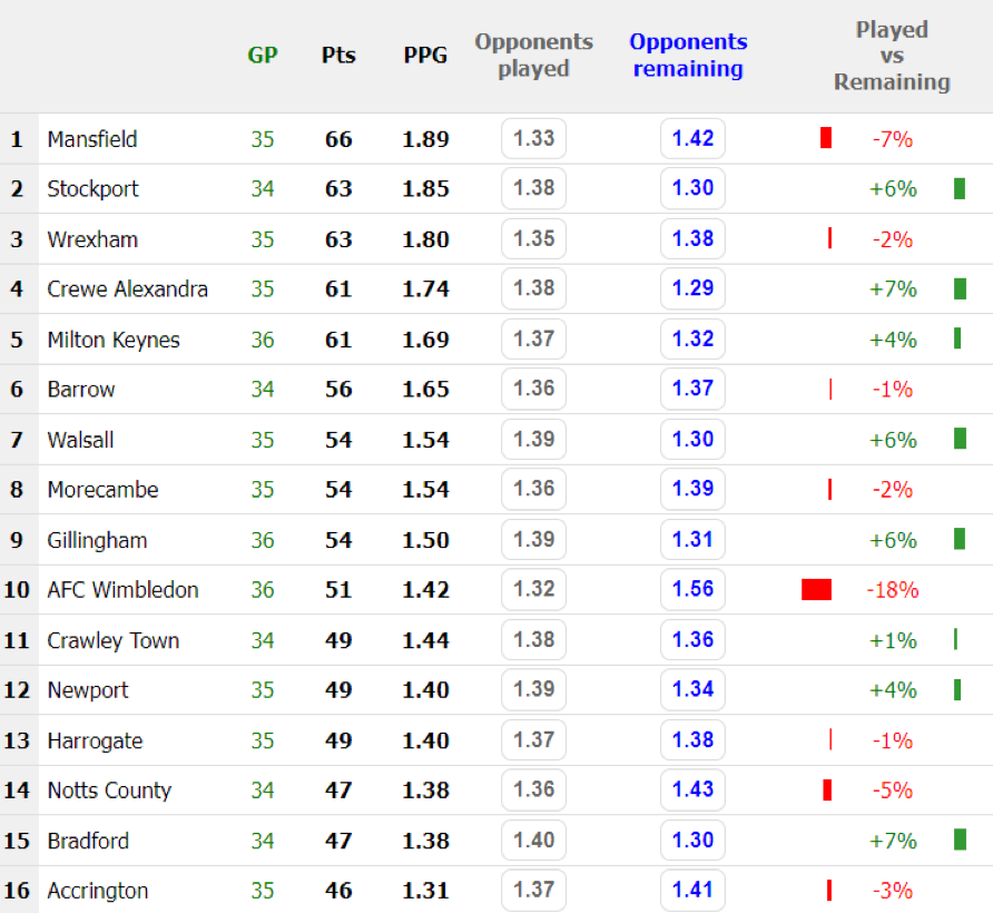 All three of Wimbledon’s league wins this calendar year have come at Plough Lane. If winning on the road is becoming an issue then so is hitting the back of the net. Ronan Curtis’ 94th minute-winner against MK was just their eighth goal in 12 league games this year. While the defence has coped fairly well despite notable absentees, clearly there is an Ali Al-Hamadi-shaped hole in Wimbledon’s attack. According to SoccerStats, Johnnie Jackson’s side also have the most difficult run-in (decided by home and away PPG) of our Royal Rumblers. If Wimbledon are going to make the play-offs then they’re going to have to do it the hard way. Given everything that they’ve overcome over the last 20 years or so, will that faze them? No chance.