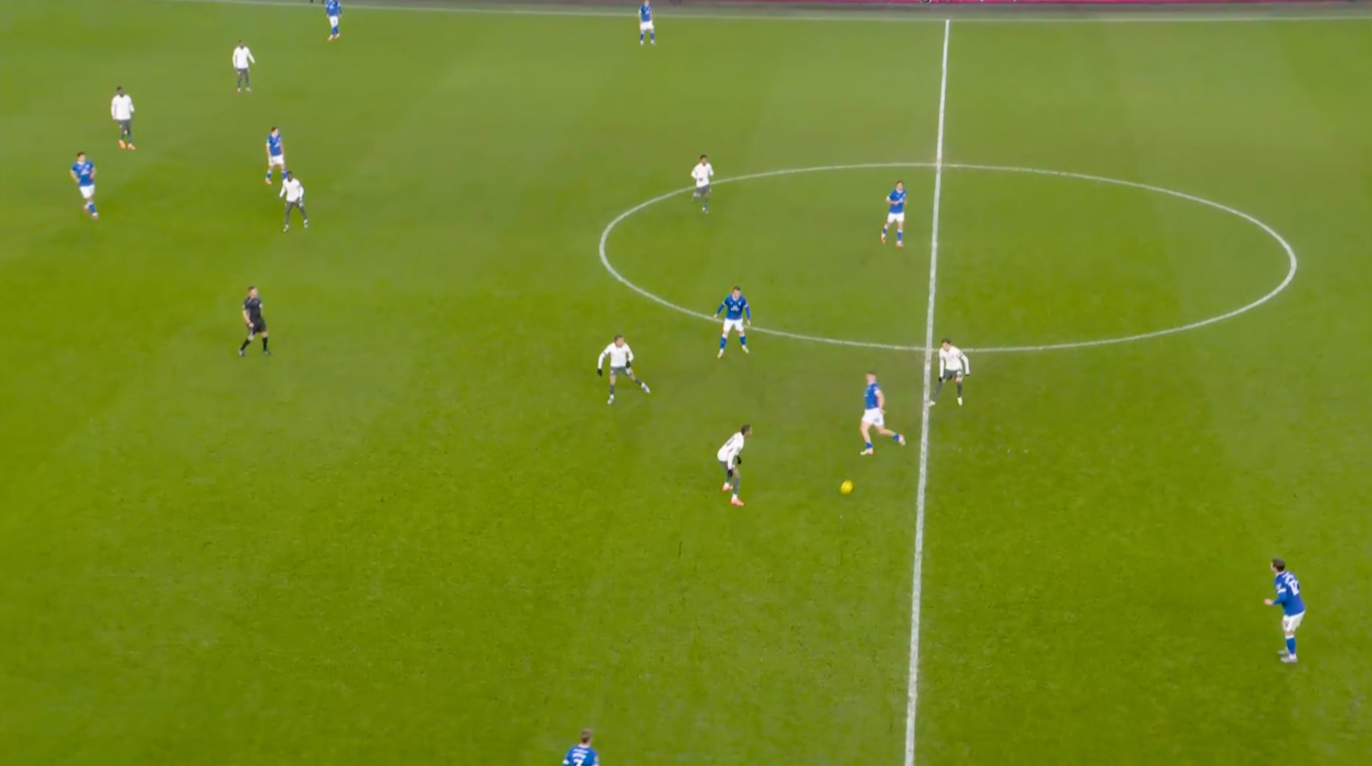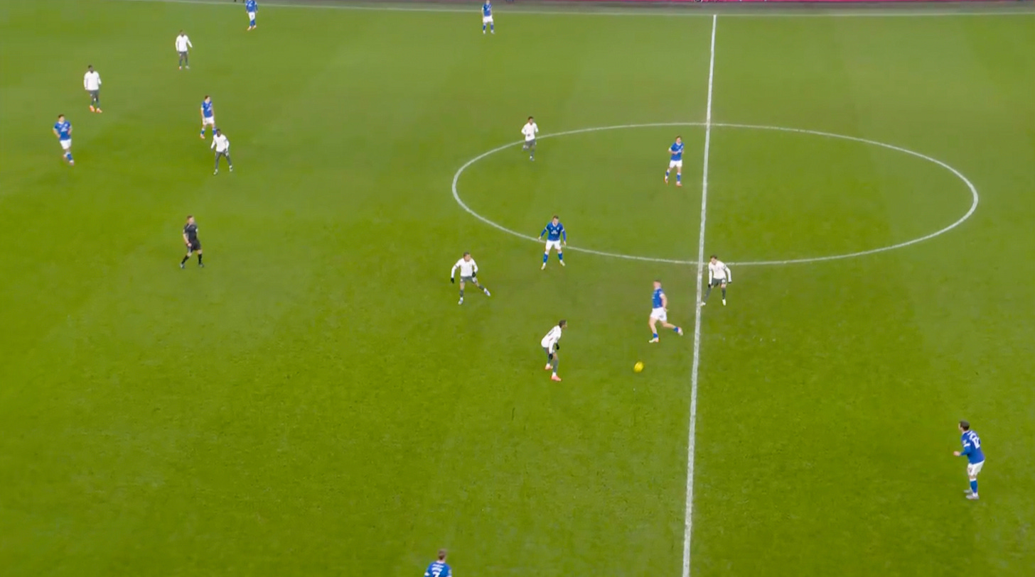 ^Lawlor (No.48) has now taken up a position in the front line, so when David Turnbull receives the ball from Bagan (No.3) and plays a first-time pass into the young centre-back’s feet…