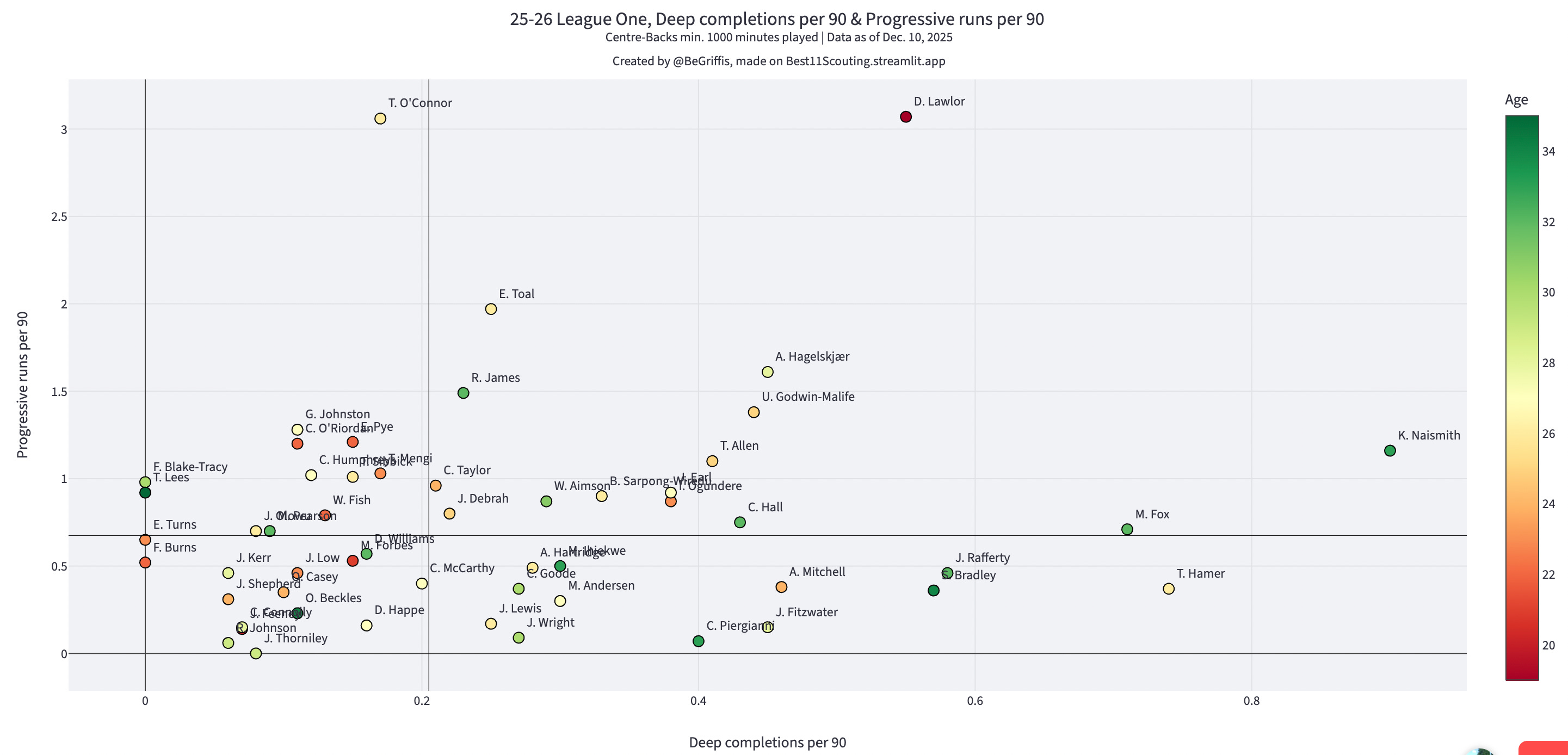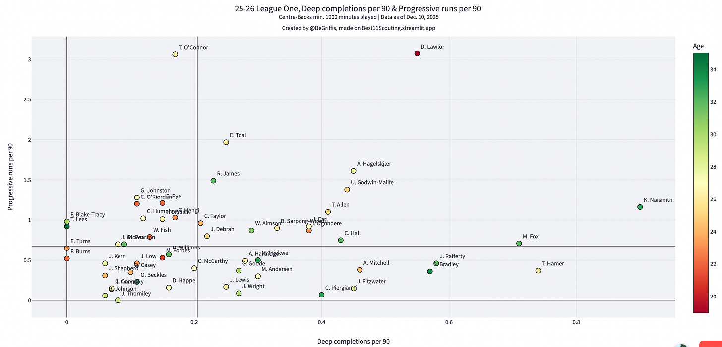 It looks simple, but this is a) what top clubs want to see from a centre-back, and b) what centre-backs in League One don’t tend to do. Lawlor’s skill at progressing the ball is very exciting; he is positive in his passing and exceptional with his carrying. He makes more progressive carries per 90 than any other player in the division, and averages by far the furthest distance. He is still adept at the meat-and-potatoes of defending, but he’s different gravy on the ball.