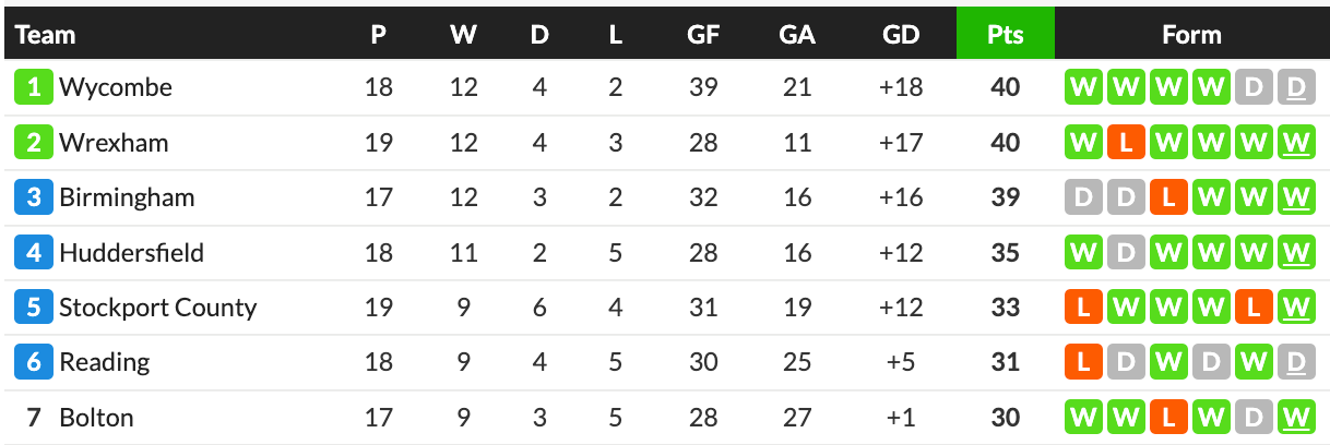 📺 The chase is on — Wycombe 1-1 Reading — ”If only it was lonely at the top…” Wycombe Wanderers have been anything but ordinary boys this season, but they were the only team in League One’s top five not to win on Saturday. While Matt Bloomfield’s table-toppers were held by Noel Hunt’s Reading, victories for Wrexham (1-0 at Burton, scoring directly from a wind-assisted corner), Birmingham (2-1 from behind at Barnsley), Huddersfield (2-1 at Mansfield) and Stockport (2-0 while limiting Exeter to three shots all game) has us wondering if this could be an automatic promotion race for the ages…