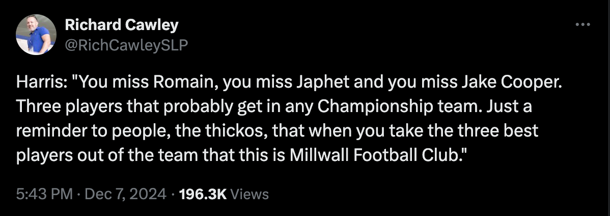 However, Harris is also a Lions legend, as their all-time top goalscorer, mostly successful manager and long-standing Club Man. This fracas will likely blow over in time. That Millwall Podcast ran a poll asking, “Can you see a way forward for Neil at the football club after yesterday’s comments about the fans?” and at the time of writing, the results are 50-50 with a slight leaning towards ‘Yes’. Very few EFL bosses would come out on the right side of that poll. Plenty of fans are defending Harris.