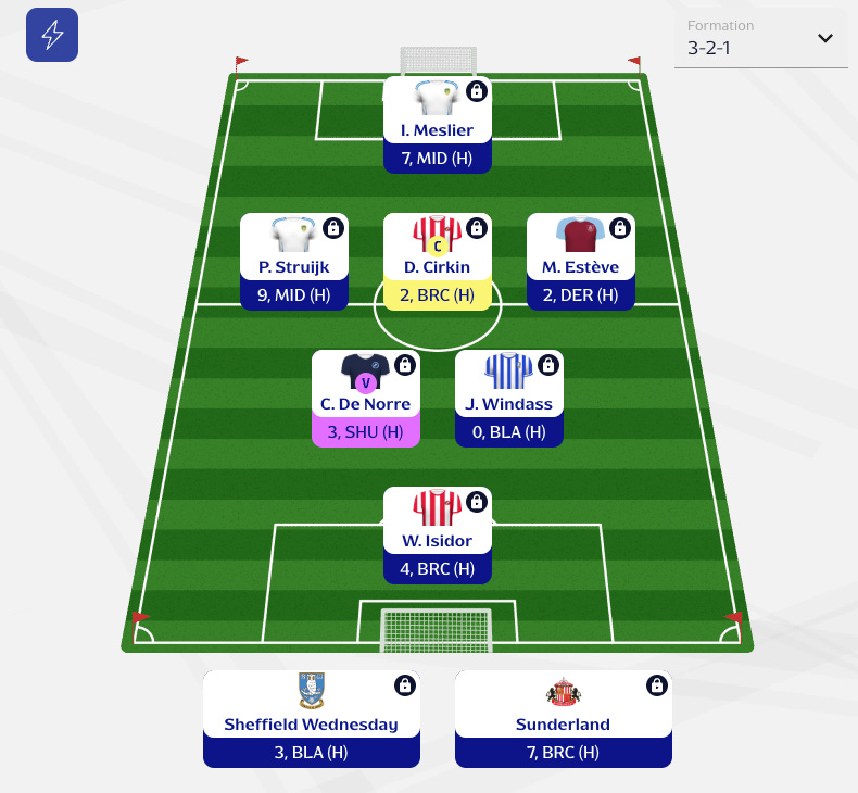 With the Championship the only league to have a double gameweek, Sam had no option but to pick an all-Champ XI. While he was in the air, bound for Dublin, one pick was changed due to the inclement weather: Ruben Colwill out and Josh Windass in. Windass duly missed a penalty. Whoops…
