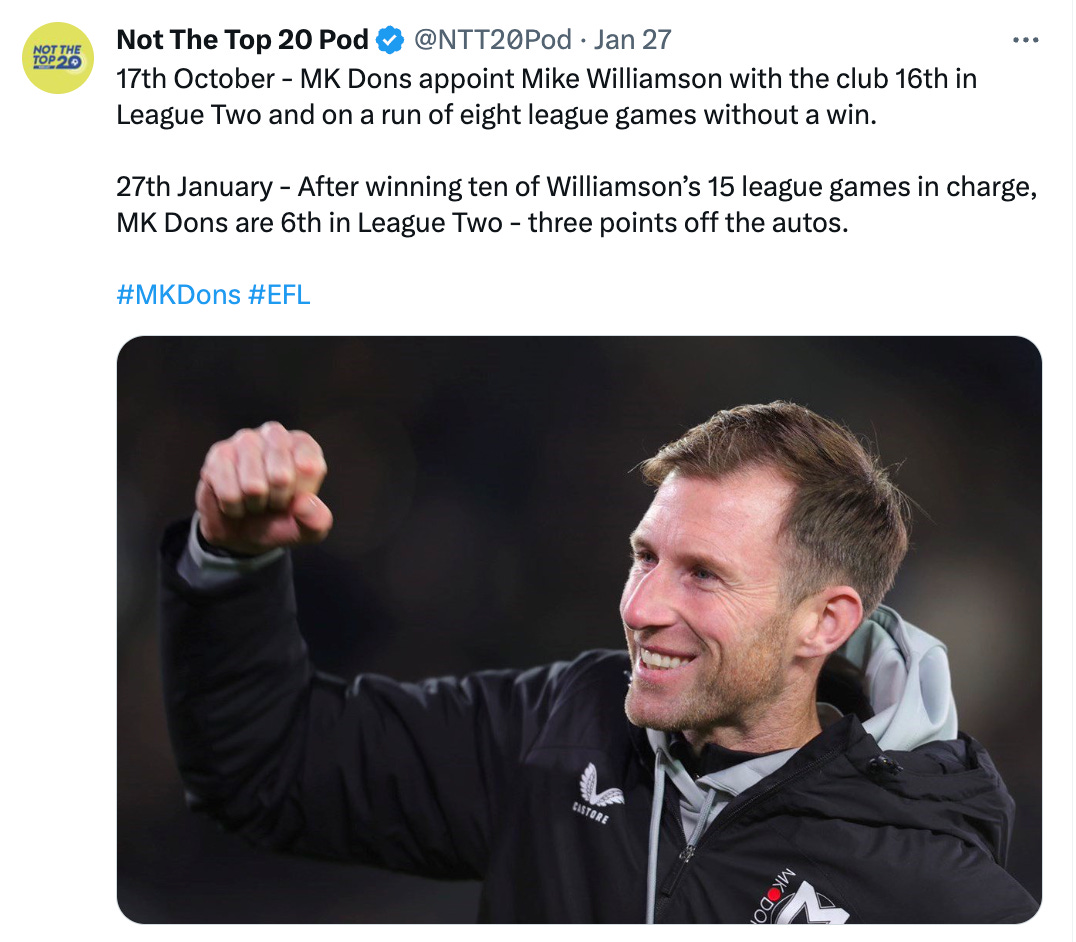 For 75 minutes, this was an even game, with both sides creating bits and bobs without grabbing things by the scruff of the neck. Then MJ Williams bounced home a volley to give MK Dons the lead, and Alex Gilbey doubled it ten minutes later. New Mike Williamson stats just dropped:
