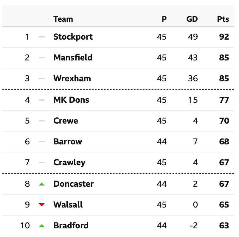 However, the visitors wanted to tie up fourth spot as they prepare for the play-offs, and goals from Alex Gilbey, Max Dean, Stephen Wearne, Emre Tezgel and Ellis Harrison were enough to do so. Harrogate now sit in the bottom half, five points adrift of Crawley with one game left following three wins from 15. MK, guaranteed fourth place, can relax on final day and wait to see who their dance partner is in the play-offs.