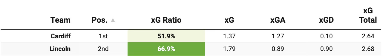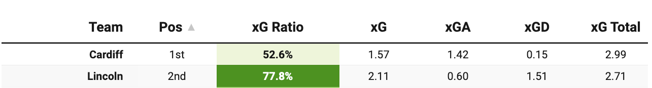 Over five games, both clubs are edging toward xG totals of 3.00 per 90, but as you can see above, Lincoln’s share of the xG is more than 20% higher than Cardiff’s. Teams are scoring freely, but the Imps are giving up very little. The results of those games?