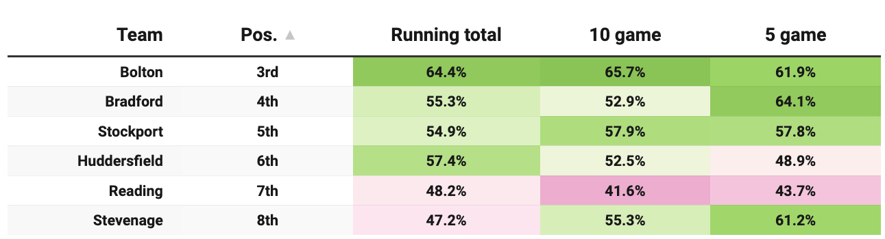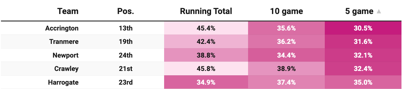 Per our comparison tables, there isn’t a huge sign of improvement about the bottom two teams, Harrogate and Newport. If they are to pull off an escape, it will probably have less to do with their improvements and more to do with those around them failing and falling faster.