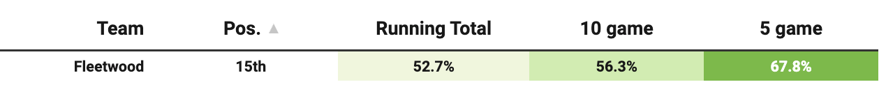 In their last five games, Fleetwood have an xGA per 90 of 0.65, which is almost half that of their season-long xGA of 1.28. Positive signs – although if I were up in front of the judge as an expert witness, I would have to point out that fixtures against the languishing pair of Newport (0-0) and Barrow (3-2) are making it all a bit noisy, so help me Cod.