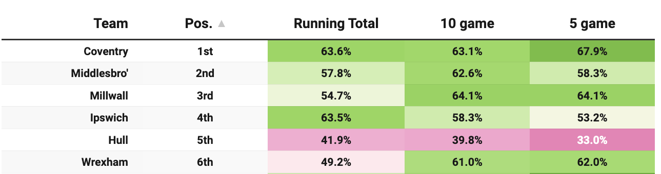 The wheels are very much ratcheted onto the Tractor Boys’ machine. Kieran McKenna’s side are ploughing through the Championship field at a rate of 2.00+ PPG over 5-game and 10-game samples.