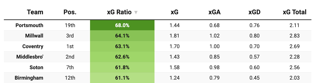 With a league-best xG ratio over the last 10 games (68%) underpinned by superlative defensive numbers (0.68 xGA per 90), poor old Pompey might’ve expected better than a 14-point return from their last 10 fixtures.