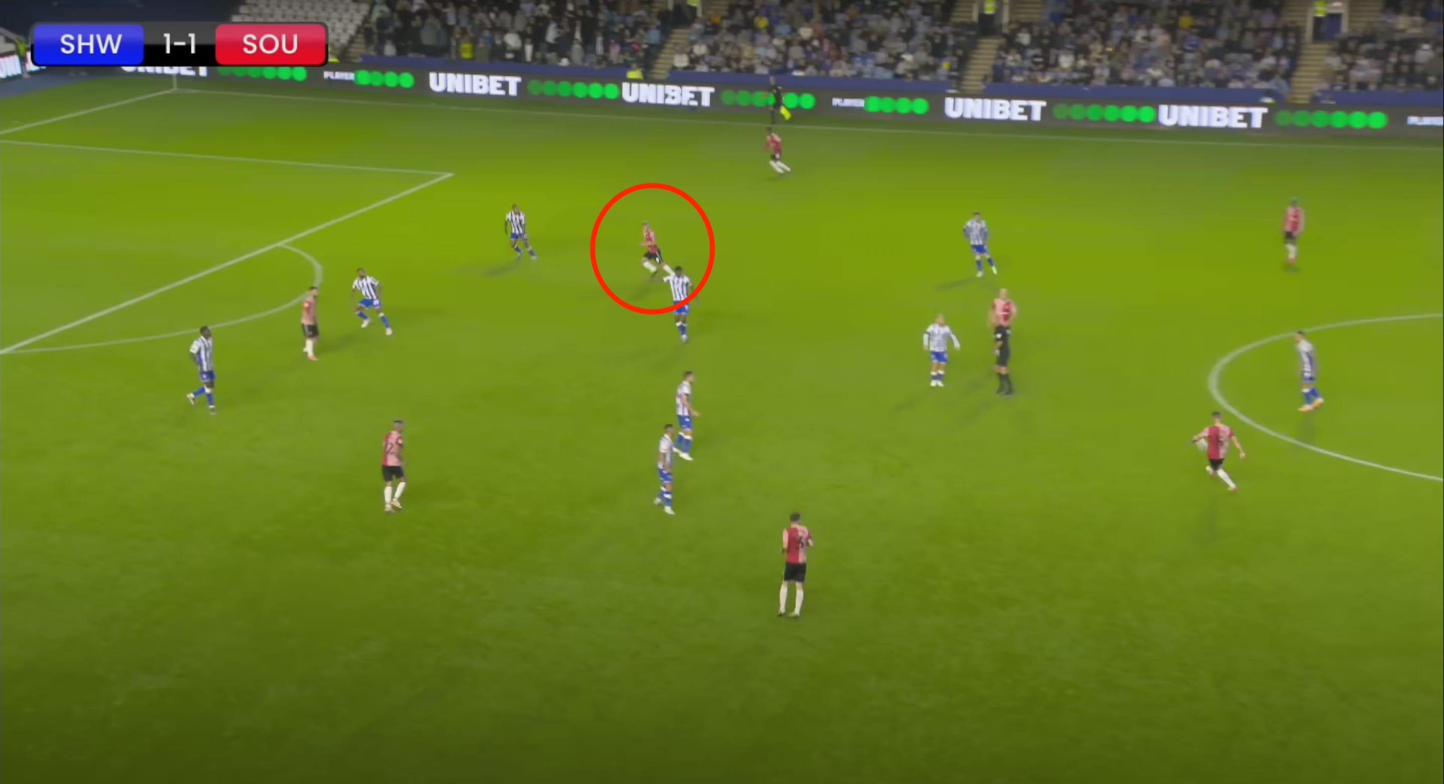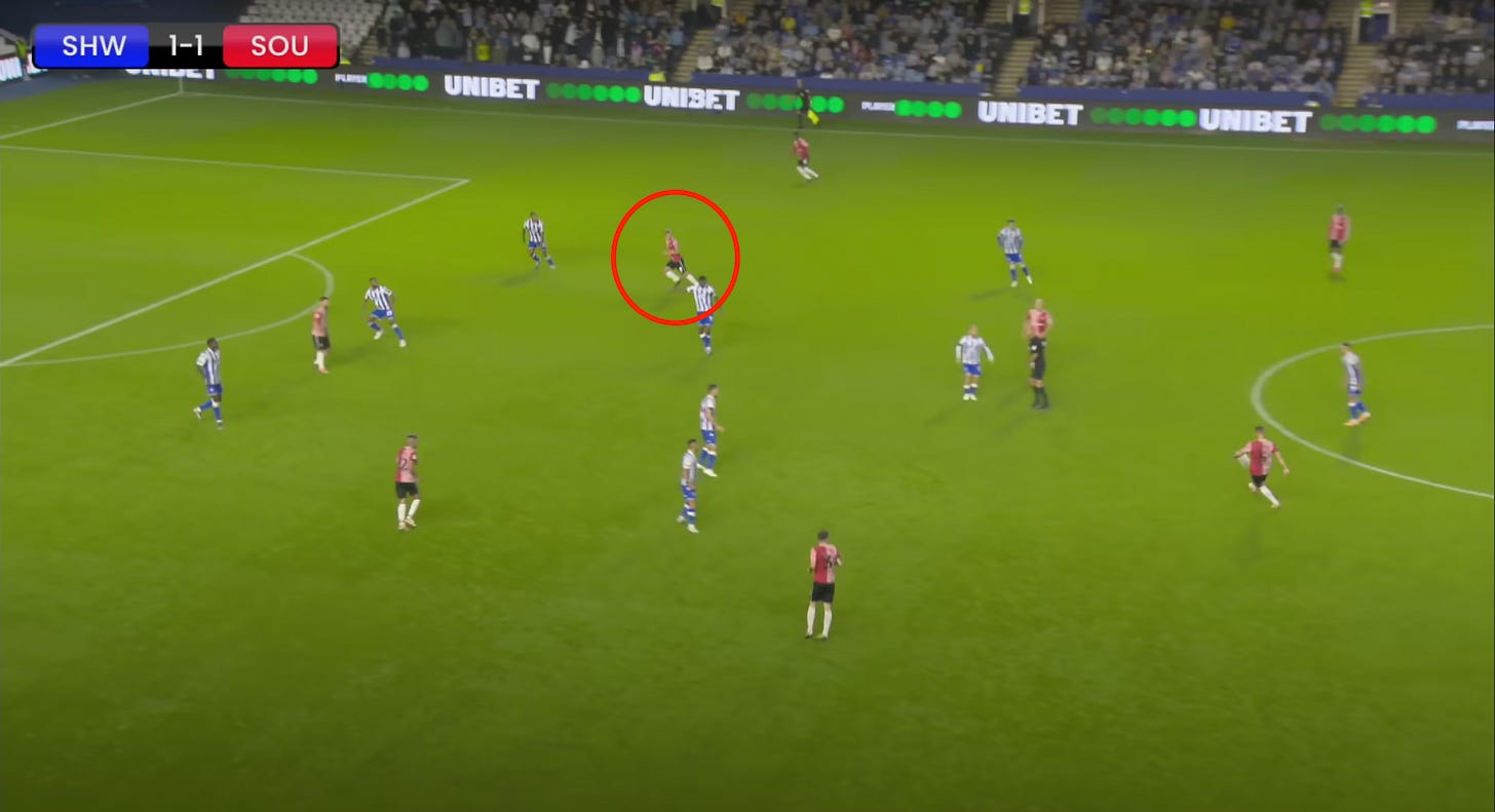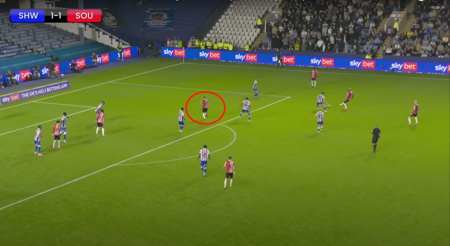 Here, James Ward-Prowse (who has since left Southampton for West Ham) makes a forward run. It’s difficult for defensive midfielders to track these runs all game, so Wednesday’s left-back, Akin Famewo, moves narrower to make sure there isn’t an easy ball into JWP. The consequence is that Tella has acres of space to receive the pass on the right wing, and dribble into the box. He cuts in and shoots wide.