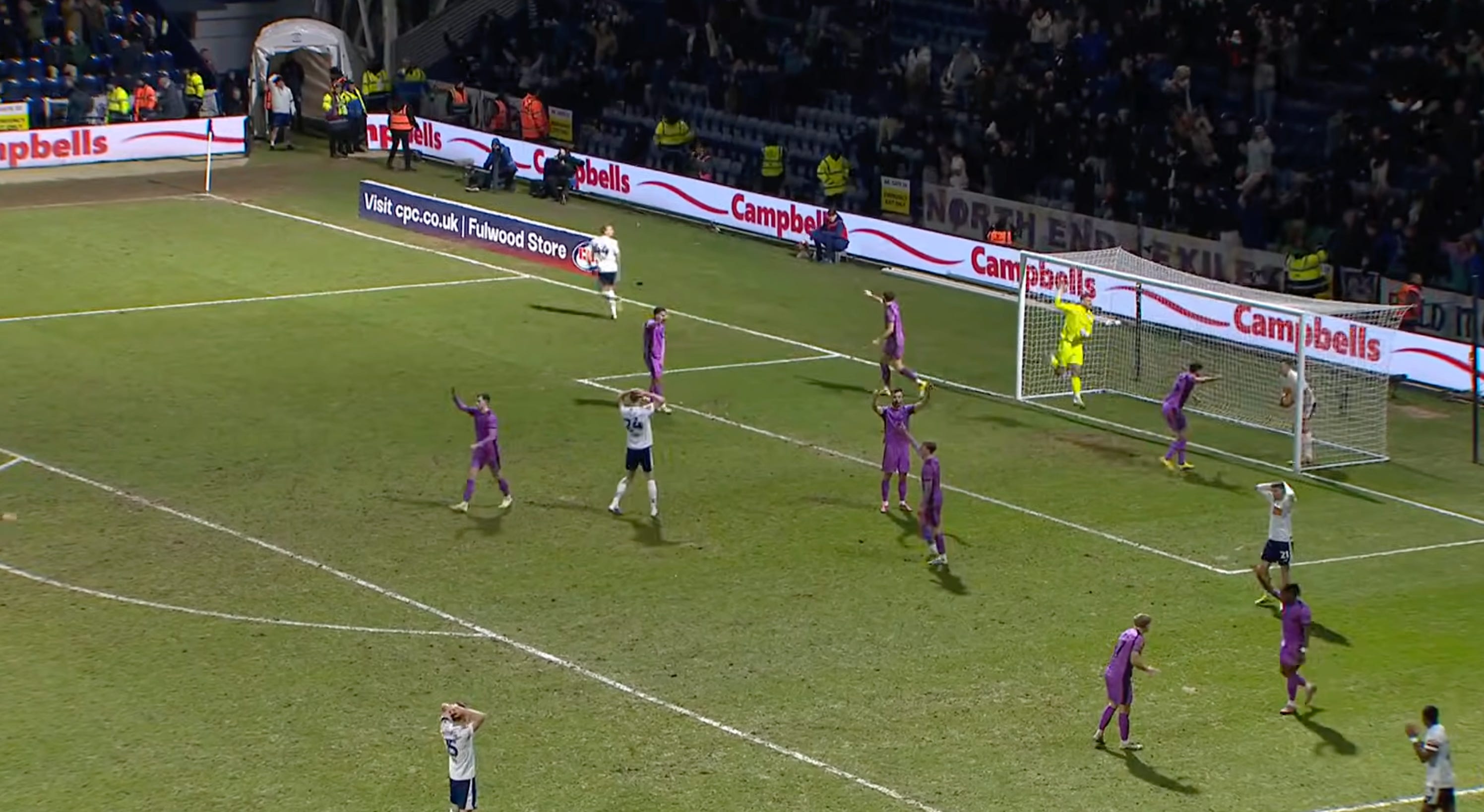 Meanwhile, Wigan were winning 1-0 at Preston, 20 miles up the road and 35 places up the pyramid. Harrison Bettoni, 18, struck with a heavily deflected shot that looped so slowly past Daniel Iversen, he was turning around to pick the ball out of the net before it had even nestled there. On a dog of a pitch, Wigan’s Callum Wright sent a penalty over the bar, then in the 98th minute Sam Tickle brilliantly denied Alfie Devine’s would-be equaliser. Brad Potts’ strike from the rebound was ruled offside, prompting joy from Wigan’s players, despair from Preston’s, and disappointment from Potts (No.44) once he’d eventually finished celebrating in front of the stands.